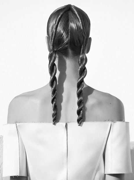Para Eyreka, hemos creado dos espejo-imagen cuerda "Francés" trenzas a ambos lados de la cabeza. Para crear una imagen simétrica, mueva cada lado de la cabeza en direcciones opuestas - en otras palabras, en la segunda foto, doblado las dos mitades de la izquierda a la derecha y luego torció las mitades alrededor de la otra a la izquierda; Había torcido las dos mitades de la derecha a la izquierda y luego torció las mitades alrededor de la otra a la derecha. Si quieres que trenzas de la cuerda para mover en la misma dirección como en la primera foto, vas sólo gire todo en las mismas direcciones en ambos lados de la cabeza.