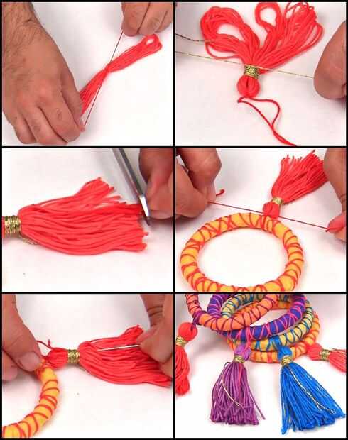 Usando una aguja grande, hilo de rosca los extremos sueltos por el centro de la borla y recorte