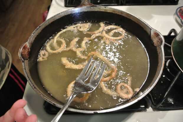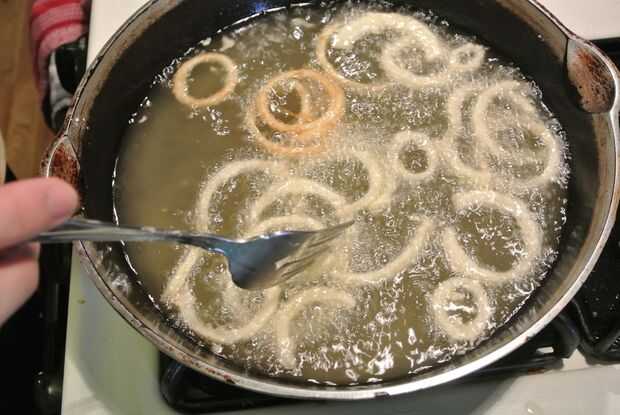 Cuando el aceite alcanza la temperatura deseada (320-350), iniciar dragado las cebollas. Para ello, el primer lugar algunas de las cadenas de cebolla en la leche, apenas un breve chapuzón. A continuación, echar la harina a la cebolla leche (mi hermana le gusta a rastra doble pero francamente, creo que hace demasiado empanado y cebolla-ringish). Cuidadosamente caer en el aceite, desconfiando de salpicaduras y asegúrese de empujar, revolver y mueva las cuerdas de la cebolla (yo usé un tenedor gigante). Freír las cebollas hasta que estén un poco dorados y escurrir sobre toallas de papel.