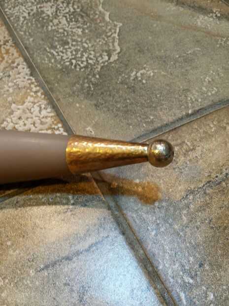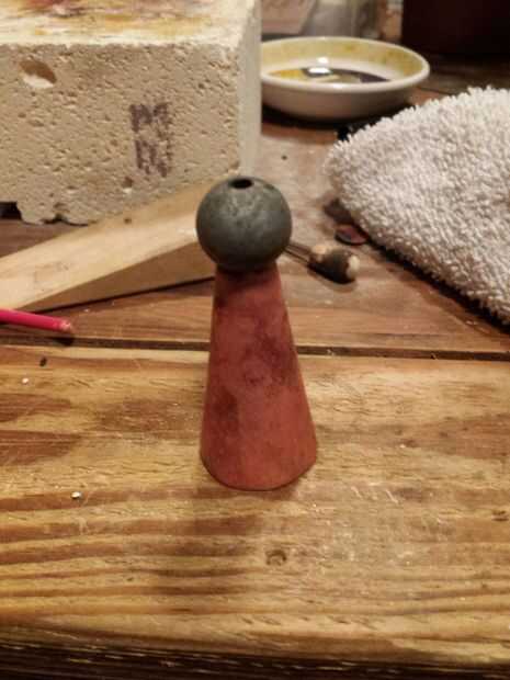 La bola de cobre amarillo era difícil porque era tan espeso (difícil que caliente bastante antes el flujo quemar) la soldadura sobre el cono. En la imagen se puede ver que el zinc llegó a la superficie de la bola. Tuve que arena esta apagado para el latón por debajo. Archivé la costura para mezclar el metal. Salmuera, secado, patina!