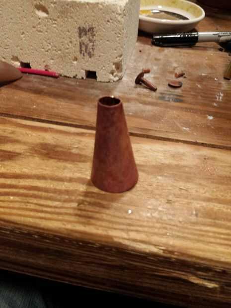 No tengo un cono en forma de mandril así que tuve que improvisar. Comencé en el mandril del anillo con el mazo de cuero crudo. Sólo seguí a trabajar el metal hasta que las costuras se reunieron, fuera del mandril. Entonces soldó la costura.