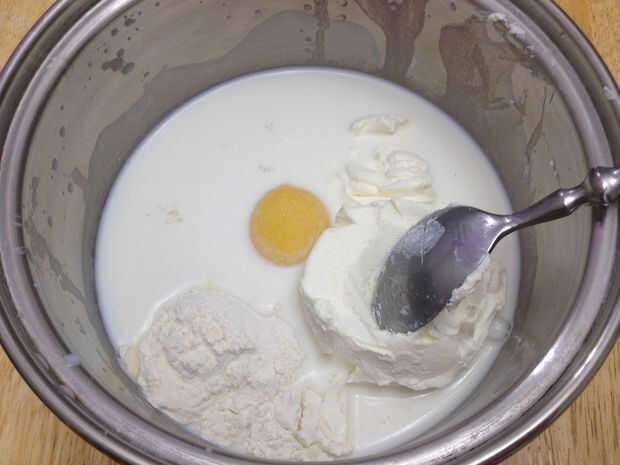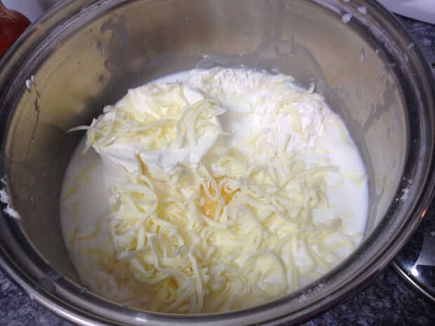 Combinar la leche, harina, yema de huevo, queso crema y 50 g de queso en un cazo, batir con batidora eléctrica. Espolvorear sal y pimienta blanca y llevar la mezcla a hervir a fuego medio, revolviendo con frecuencia. Mezcla se va espesando.