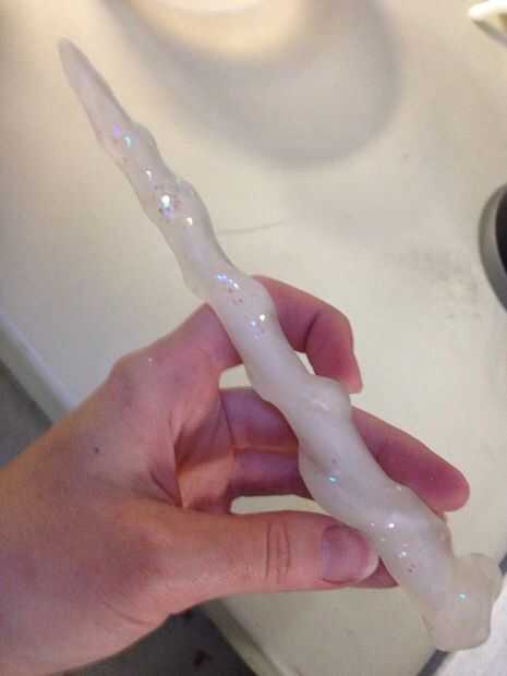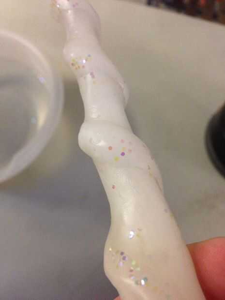 Toque un poco de brillo en la mano, del tamaño de un US $0,25. DIP el pedazo entero de InstaMorph torcido de nuevo en el recipiente de un poco más de suavidad. Retirar el material antes de que se demasiado visiblemente transparente y presione el cuerno todo a través de tu palm con el brillo. Suave a los bordes de la espiral, presionando en los bits de brillo que van.