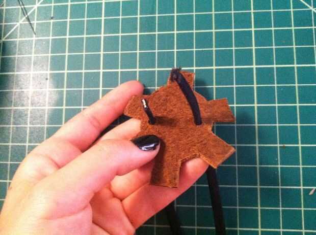 Cortar la venda abierta e hilo a través de ambas piezas de accesorio, luego coser los extremos hacia atrás juntos. Escondí la costura dentro de una de las piezas de fijación.