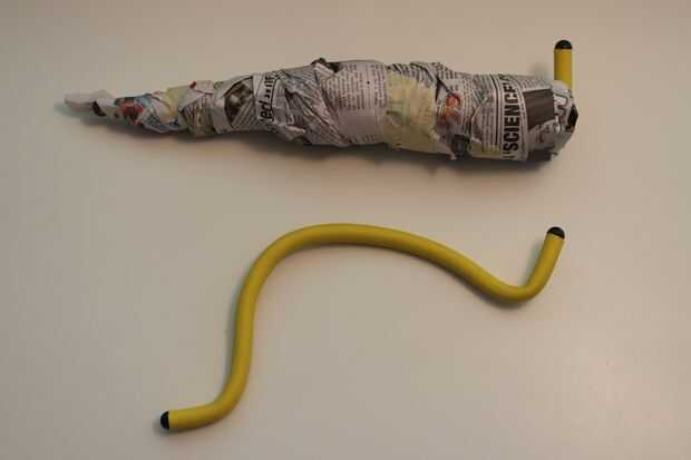 2. Envuelva cada lazo del flexi con periódico, asegurándose de que añadir más papel a la parte inferior de la parte superior. Continúe alrededor y alrededor de los lazos de flexi hasta llegar a la parte superior puntiaguda. Cinta con pedazos de cinta adhesiva a lo largo del camino.