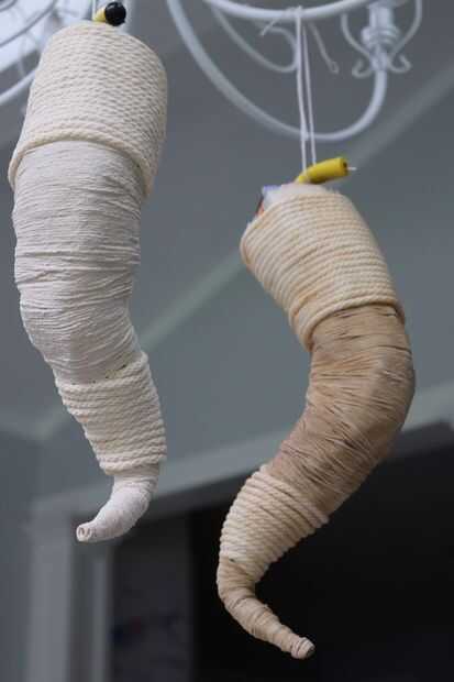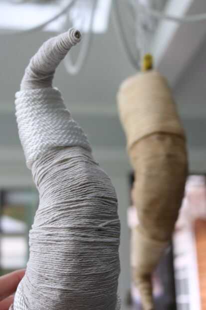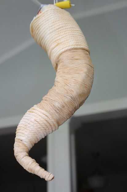 - Cuidadosamente Envuelva sus cuernos utilizando algodón twist tie guita. A partir de la punta del cuerno, lentamente y con cuidado Envuelva la ligadura en un movimiento circular perfecto hasta la parte inferior. Dejando alrededor de 6 pulgadas, cortar el lazo en la parte inferior y las pulgadas de suspensión a la parte inferior para mantener en el lugar de la cinta.
