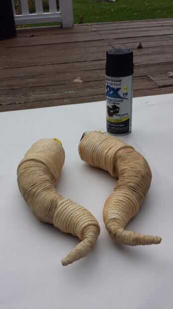 - Para pintar los cuernos negros, establecer algunos papel chatarra fuera de lugar (yo usé esas hojas de embalaje grande que obtiene de IKEA al retirar). Tienes que hacer este paso fuera para evitar que cualquier pintura en aerosol en sus pisos, mostradores o en el aire. Usted puede hacer esto en un día no ventoso!