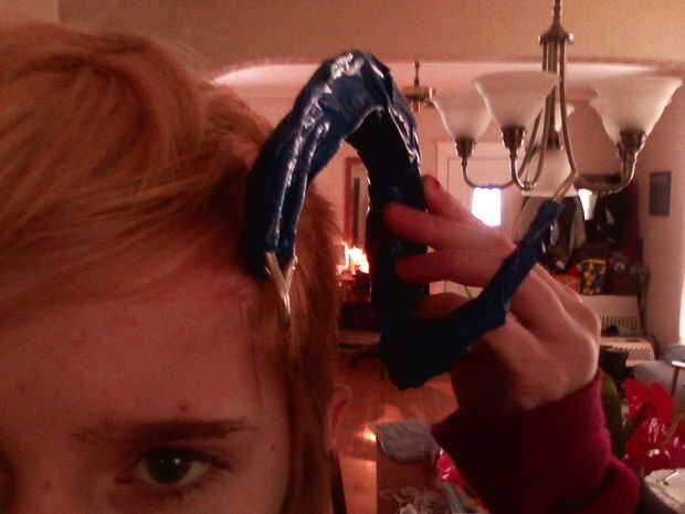 Hacer demasiado apretado si tu utilizando alambre, porque doblará todo de forma. Hice que poco a poco, se puede ver cuando lo pongo encima de mi cabeza, pero no se lo hizo mucho para que no moleste lo de fijación. Usé cinta de pato azul porque no pude encontrar mi cinta de enmascarar. Aunque realmente no importa. Cinta pato sólo hace más pesado.