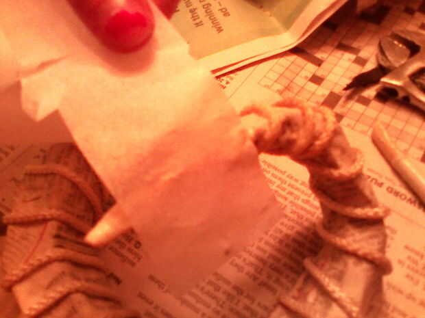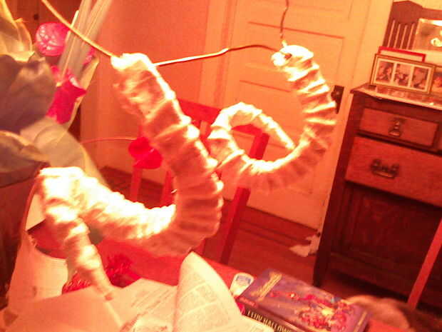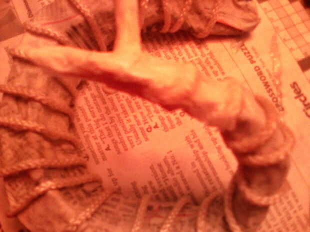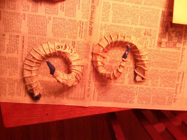 Porque he utilizado papel de tejido, cepillado algunos mache' goop la cuerda y todo en los espacios entre las crestas, apoyados por unas tiras entonces presionado en los espacios a preservar las crestas. Luego pintó ontop buena más de eso. Lo hice porque si mojar el tejido papier en el goop le justend cayendo y deteriorando. Además de esta manera le da un mejor ajuste y hace los cuernos más fuerte.