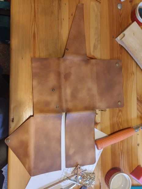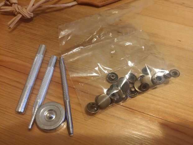 Trabajé a la colocación de éstos por cortar que la parte superior de los agujeros primero (éstos debían colocarse bien ya que son los más visibles) y luego dibujar un círculo a través de estos orificios en la piel subyacente que alinean perfectamente. Estos poppers pueden ser dondequiera que usted desee. Probablemente incluso podría salir sin ellos o utilizar otro tipo de fijación.