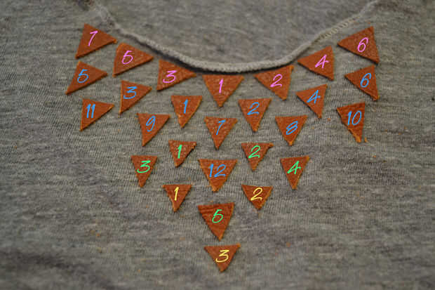 Primero poner algo entre la camisa como periódico por lo que no pega la camisa. Luego, colocar los triángulos antes de que pegue. Pegarlos en el orden que se muestra a continuación. Asegúrese de que el primer triángulo (el color rosa #1) va justo en el medio donde se dibujó el punto. (Juro que no es tan confuso como parece!)