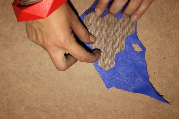Corte la madera contraste pantalla como se muestra en la imagen adjunta. Esto nos dará el apoyo del diseño. En el palillo trasero cuero y luego corte el exceso con el cortador. Este cuero de cabrito o ternero va a dar a nuestra piel impidiendo raspar madera contraste pantalla.