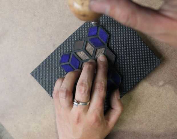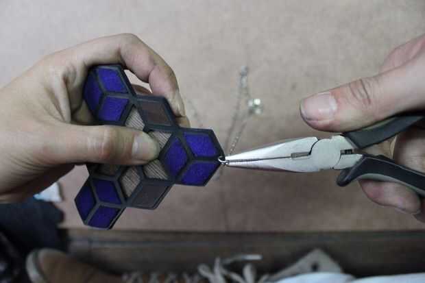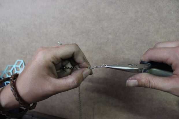 Con la lezna y el microporoso abra un agujero a cada lado donde introducir los pequeños aros de metal para la cadena.