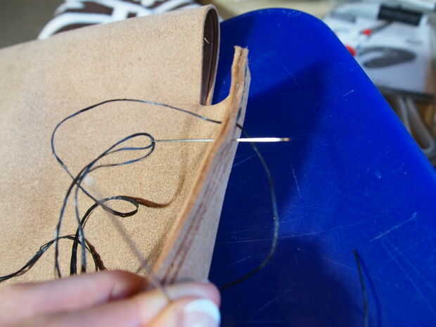Si se preparó la zona a coser, no debería ser demasiado difícil coser las costuras laterales. Si los agujeros fueron perforados, debe ser muy bien. Tenga muy cuidado de no lastimarse mientras cose. Utiliza una aguja muy afilada como mi cuero (que era más opaco) se rompió y apuñaló accidentalmente mi dedo 1/4 pulgada de profundidad. Tuve que conseguir una antitetánica debido a él!