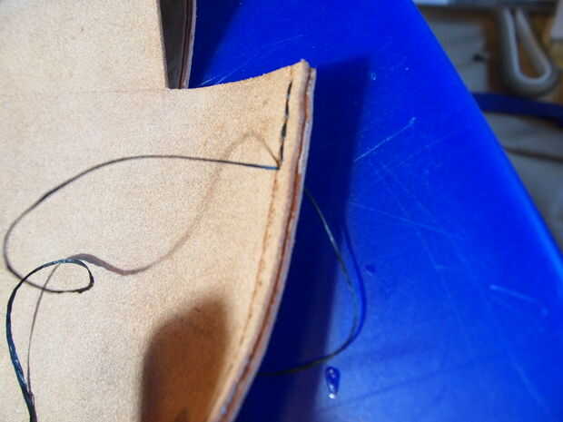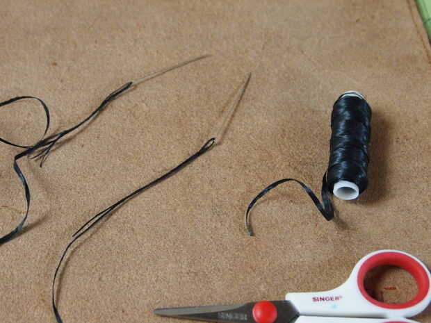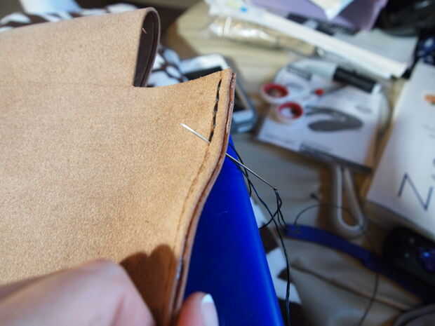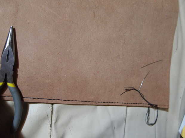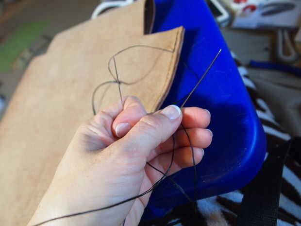 Una vez que los agujeros se perforan, usted está listo para coser. Es muy difícil explicar cómo coser el cuero correctamente, pero he encontrado un tutorial excelente foto de eso aquí. Si podía hacer algo diferente en este bolso de mano, habría utilizado un hilo de color neutro para coser las costuras en el interior. Puede encontrar este hilo encerado en las tiendas Hobby Lobby locales o en línea.