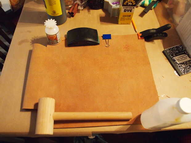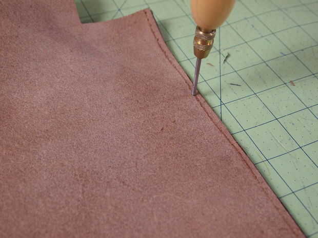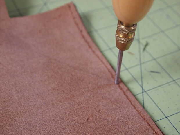 Antes de coser a lo largo de los bordes, usted necesitará utilizar el punzón para perforar agujeros en el cuero donde vas cosiendo. Normalmente la gente utilizaría un cuero costura caballo para ayudar a sostener el cuero juntos mientras cose, pero no tengo uno. Así que tenía varios tapetes de corte por debajo de mi piel y utilizan para perforar agujeros en los lados para prepararse para coser - hice con la lezna y a veces tenía que utilizar el martillo para empujar a través.