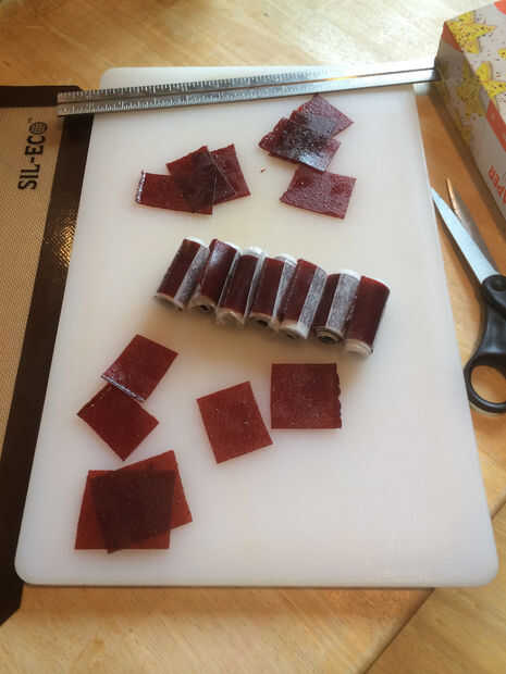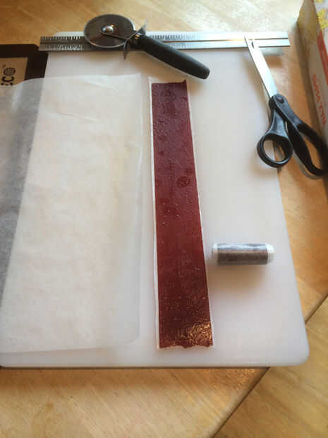 Al lado del último paso es cortar tiras de papel pergamino de aproximadamente el mismo ancho que las tiras de cuero. Coloco una tira de cuero en un borde del papel de pergamino, y luego tomar tijeras y correr hasta el otro lado. Enrollar el cuero de fruta con el papel de pergamino. Esto hará más fácil de pelar y comer más tarde. Usted puede ser tentado a usar papel de cera. No. Papel de cera se adhieren a la piel de la fruta hasta el punto donde usted no pela lo apagado muy bien. Se rasgue y se adhieren a la piel terminará recogiendo en él mucho tiempo y terminarás comiendo algún papel de cera.