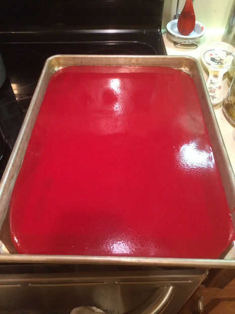 Utilice una espátula de goma o una espátula offset para suavizar la jalea de frutas. No te preocupes si el fruto toca los lados del rollo de jalea. Es inevitable. Una vez que la fruta es distribuida uniformemente hacia fuera, dar el pan un poco jiggle a resolver cosas que duran poco.