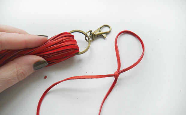 .. .con el arillo en la mitad o tus franjas de cuero, doblarlas por la mitad. Que encierra el anillo en el redil. Tome la longitud 30" que a un lado y un nudo del resbalón. Deje un extremo corto de la cola que tiene la misma longitud que su tassle doblado.