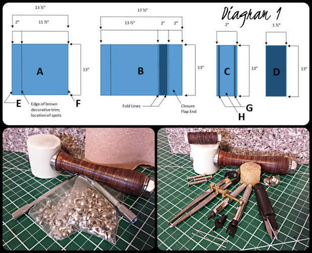 Suministros básicos - diagrama 1, artículos terminados de partes I-II, pegamento, marcadores de la tela blanca y negra, gruesa chatarra de herramientas de cuero, bloque de cera de abeja *, hilo de nylon encerado marrón oscuro, dos agujas de coser de mano, losa del granito, tabla de cortar o mesa pondo, borde recto, libros pesados