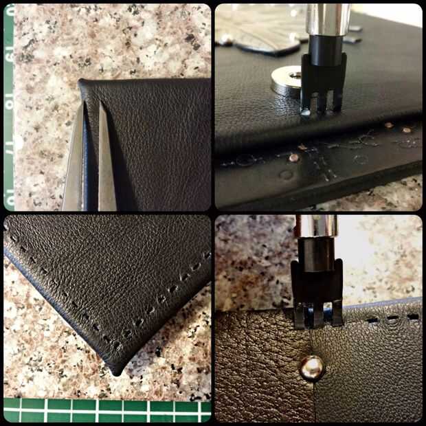 Tradicionalmente, las aplicaciones de la puntada de silla de montar un diamante el cincel o el punzón punzón para perforar los agujeros; Siempre he utilizado el golpe del cincel recto según mi preferencia. Comienzo perforando agujeros en el centro para que ellos están espaciados igualmente a cada esquina. Cuando me bloqueo mis puntadas, a menudo voy a volver hacia atrás una vez más a través de un agujero de la anterior bloqueado sostener puntadas para un seguro extra. He visto muchas formas de bloquear el hilo en la aguja y de bloqueo. Digo todo lo mejor para ti es la manera correcta, siempre y cuando lleva a cabo. Mostró brevemente en el segundo collage como bloquear mi hilo en la aguja y bloquear mis puntadas.