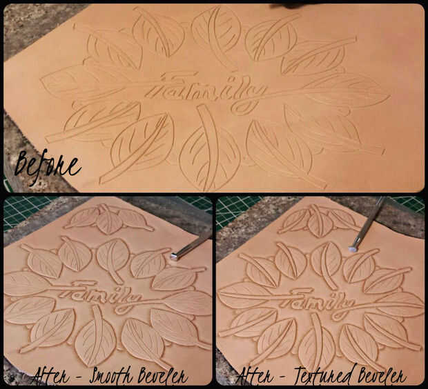 - Cuando liso biselado es completado, me agarra a un beveler textured (craftool B971) y empezar a biselar la parte cerrada de la hoja tallo, otra vez en el exterior del corte. , Consulte 'Después - Textured Beveler' imagen.