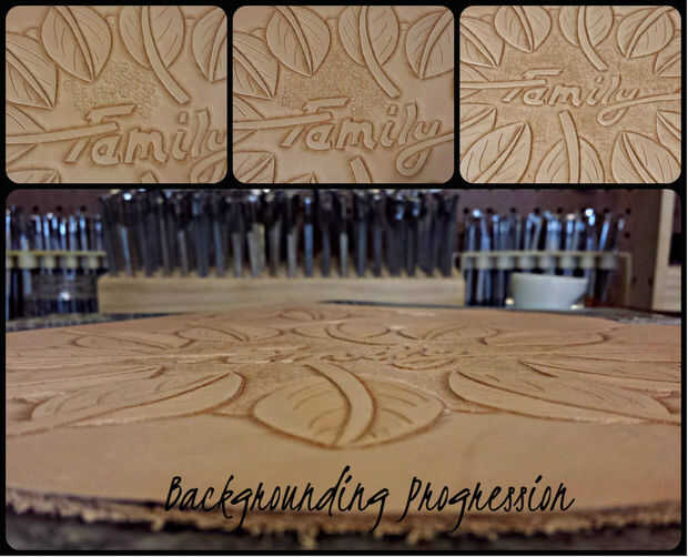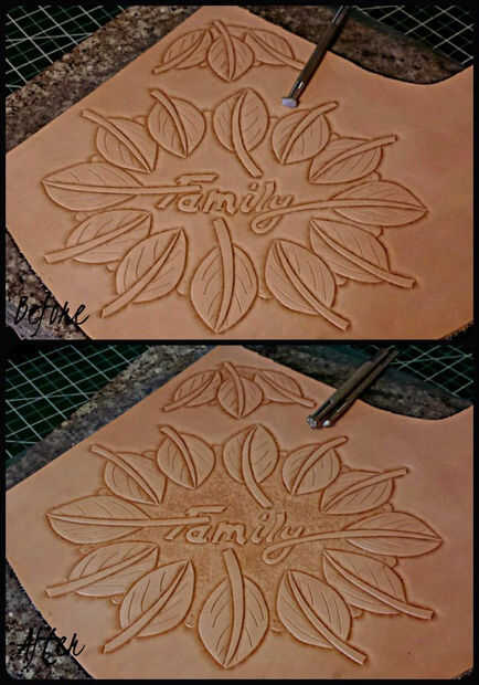 Consejos: Esta herramienta requiere mucho menos técnica que el Biseladoras. He encontrado que es una regla general para muchas cosas en el trabajo de cuero comenzar en el centro de los bordes para evitar errores. Para crear una textura consistente y completa en el fondo, traslape las impresiones de la herramienta varias veces encima. Por favor refiérase a la imagen, 'Segundo plano progresión', para ver la progresión. Medida que se acerca a las zonas biseladas de los bordes, comienzan a dejar en la fuerza de sus ataques. Esto hará que el fondo parece que se desvanecen en el biselado. Se puede hacer paso 7 antes paso 6 para lograr prácticamente el mismo efecto. Para mí, biselar los cortes primero tipo de construye una presa contra las otras marcas de herramienta. Importante: Con pequeñas cabezas herramientas como craftool E294-04, asegúrese de que utilizar menos fuerza al golpear impresiones de lo que usted harían con una herramienta más grande. Debido a la menor superficie de la herramienta, podría muy fácilmente libra a través de su piel; He hecho esto muchas veces antes. UGH!