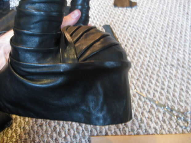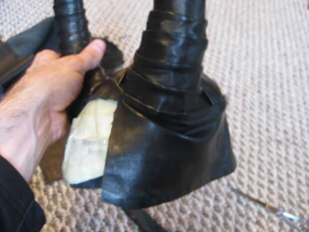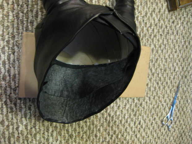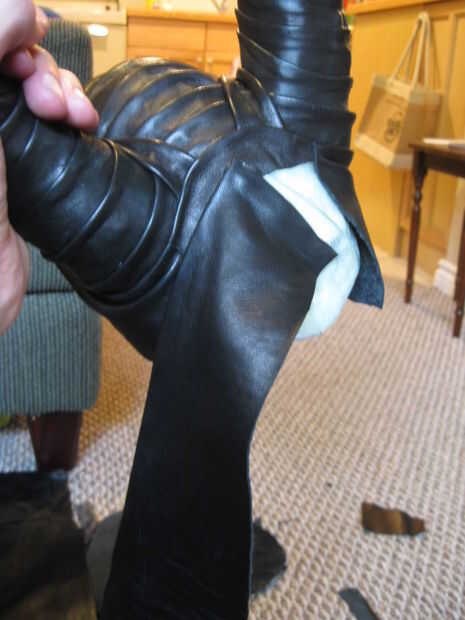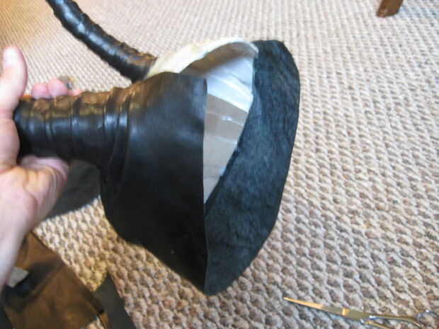 Esto requirió mucho de poner encendido y apagado los cuernos para medir las correas que van alrededor de espalda. Encontrar sus piezas más largas de cuero, poner los cuernos en y el uso cuero para envolver los cuernos en su cabeza. Una vez haya encontrado su tamaño, cortar y pegar. Suena simple pero pueden requerir algunas pruebas.