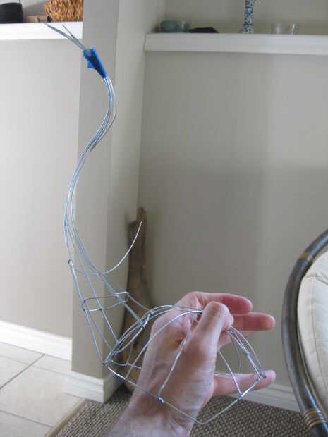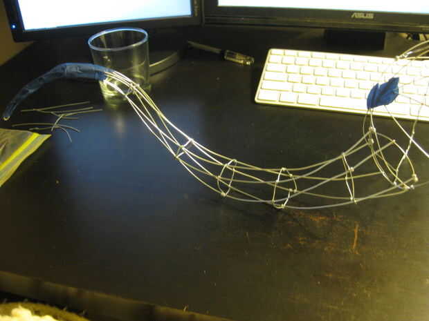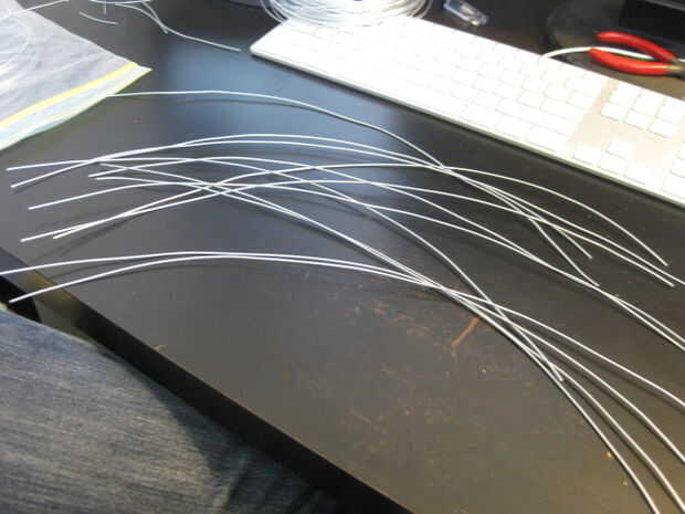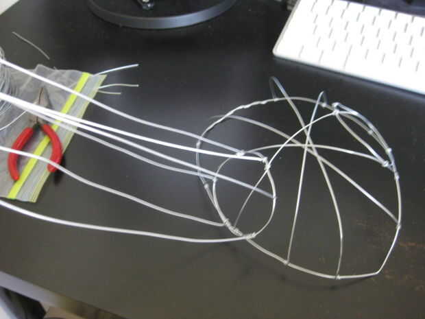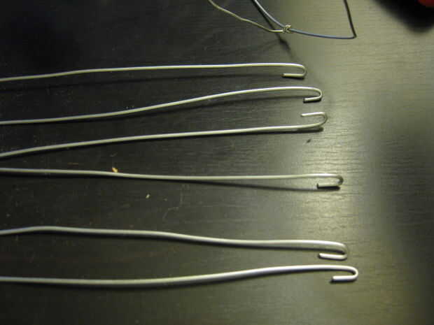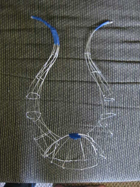Cada cuerno se hace de seis cables con un montón de enlaces circulares a lo largo de la longitud del cuerno. Cortar doce pedazos de alambre, quizás 16 pulgadas de longitud (o lo que le apetece). Enganche los extremos del alambre y envolver a intervalos uniformes para el anillo en el lado de la tapa.
