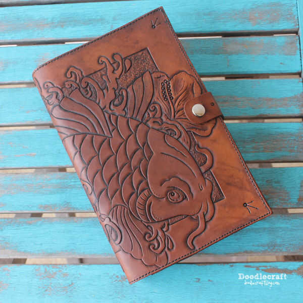 Cuero funda cubierta de libro con Koi y Hibiscus!