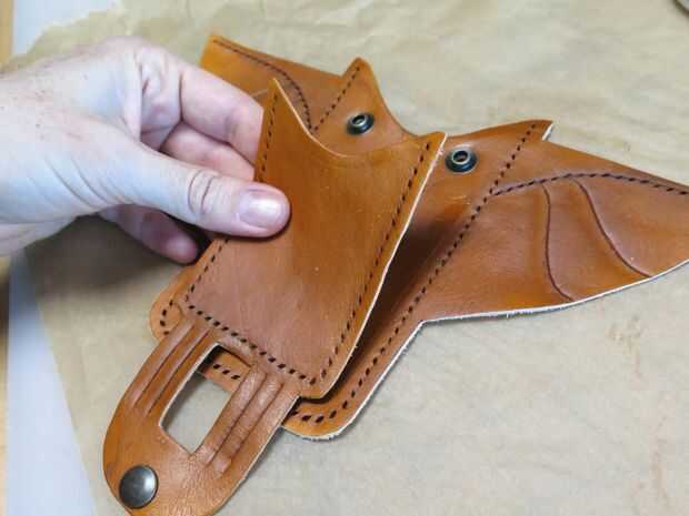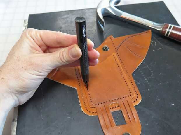 Con el bolsillo en el lugar, usé mi cincel costura para perforar a través de ambas capas utilizando los orificios existentes en la capa superior como guía.