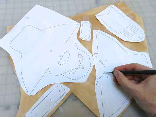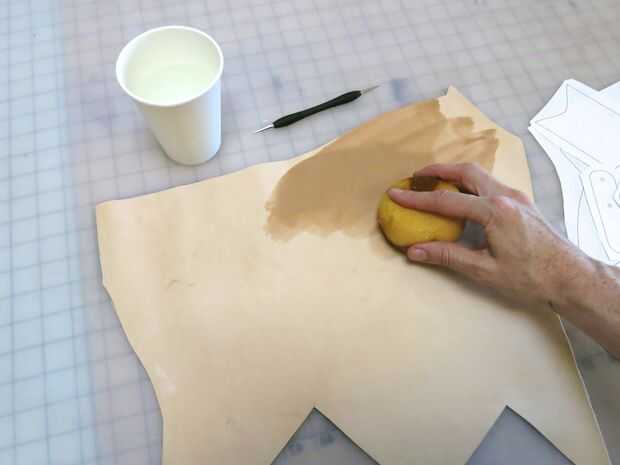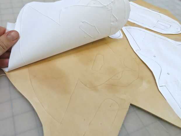 Luego utilicé un bolígrafo stylus de modelado para trazar las líneas de corte, agujeros, líneas de costura y las líneas de detalle a través del papel sobre el cuero húmedo.