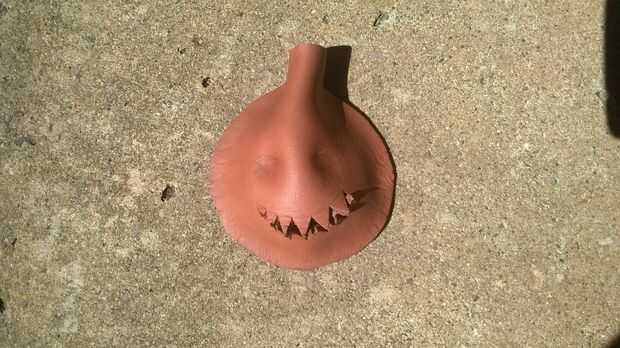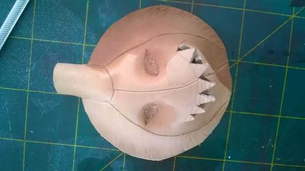 3. Después de que ha cortado a través de la sección de los dientes, humedezca la zona de los dientes con algún agua (cuidado de no mojar otras áreas o puede perder su forma) y las filas de dientes de la curva ligeramente hacia fuera (presioné la parte posterior de la piel para conseguir empujando hacia fuera muy bien).