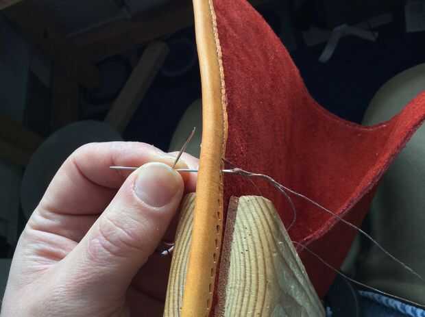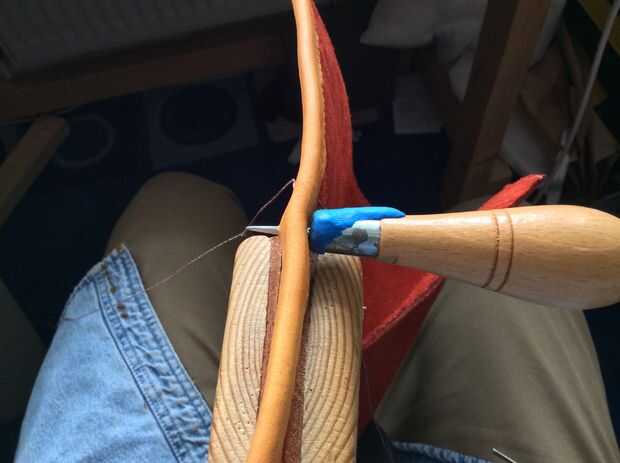 Utilizar la técnica de la puntada de silla de montar, que requiere el uso de dos agujas (una en cada extremo del hilo de rosca) con aguja pasando por todos los agujeros en direcciones opuestas a su contraparte. Esto no es fácil si no tienes la piel verticalmente, por lo que yo suelo utilizar un Pony de costura casero para sujetar el trabajo entre mis rodillas.