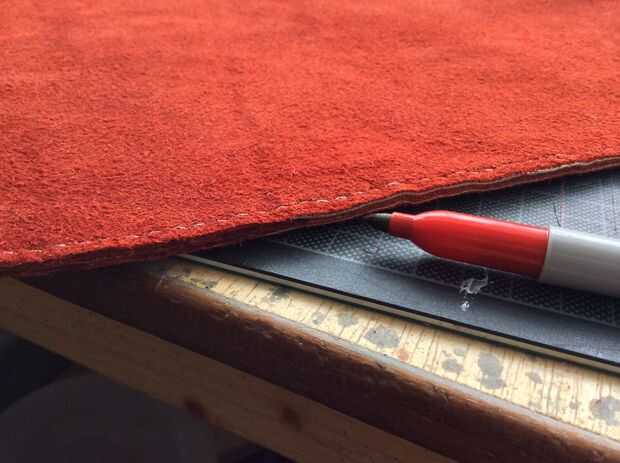 Cuando el pegamento se seca, cosido todo alrededor de la frente y los lados para asegurarse de que no se iba a separar. Antes de introducirlo al cuerpo principal, un truco final fue utilizar una pluma Sharpie rojo para colorear el borde de la gamuza. Algunos cueros no obtener color a través de cuando se hacen, y este tenía una fea banda blanca corriendo por el centro de la gamuza. El sharpie había curado!