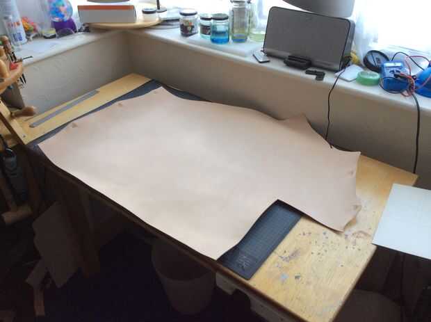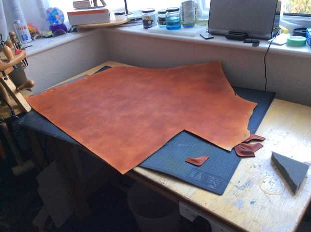 Yo estaba usando cuero de veg-tan grueso de 2mm de la carcasa de la caja, y antes de marcar para cortar, utilicé unos abrigos de Fiebings "Tan británico" tinte para colorearlo de cuero. A continuación, se marca con un punzón cero, literalmente, rayar las líneas de corte en el cuero.