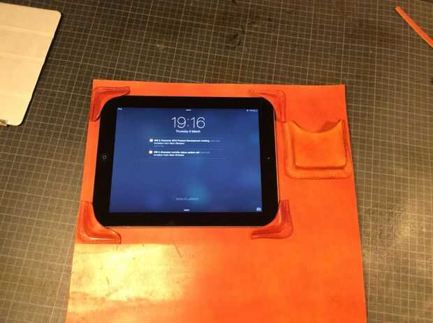 Para asegurarse de que las lengüetas estaría en el lugar que necesitaba para usar el iPad para markp las posiciones de la lengüeta. Otra vez, las posiciones fueron ligeramente marcadas en el cuero con un punzón para que yo no perder las marcas o añadir tinta antiestética manchas.