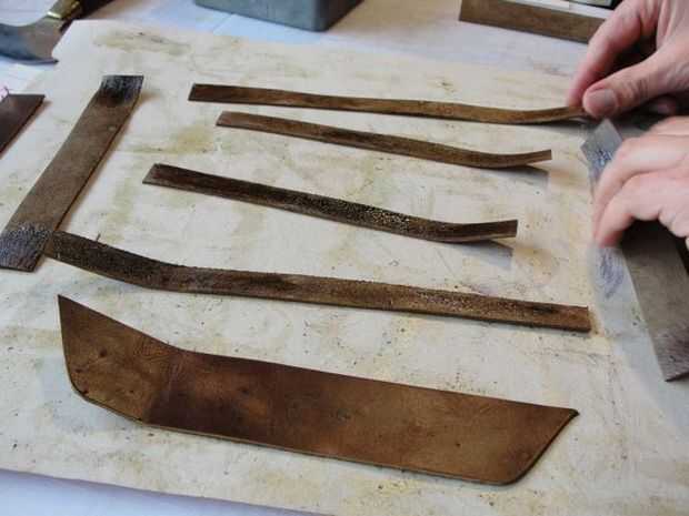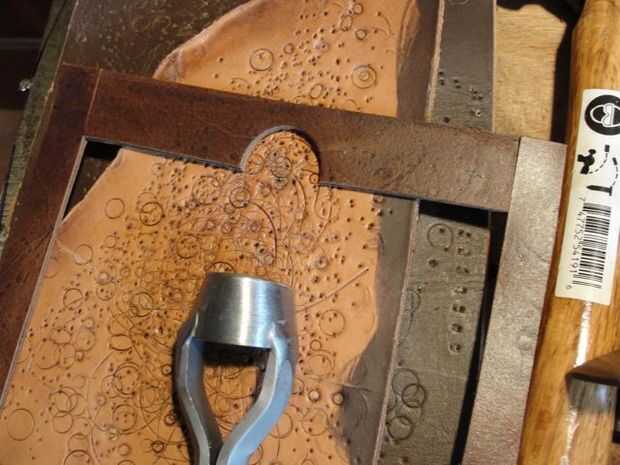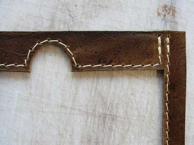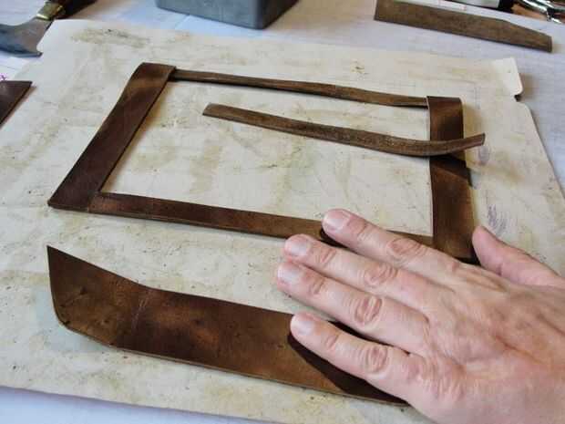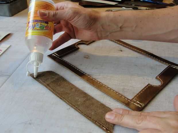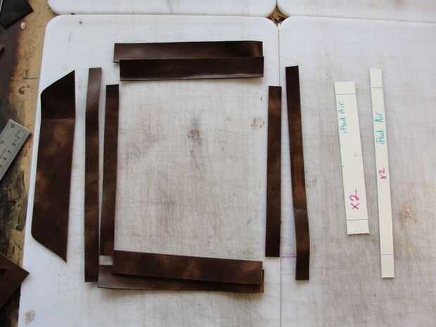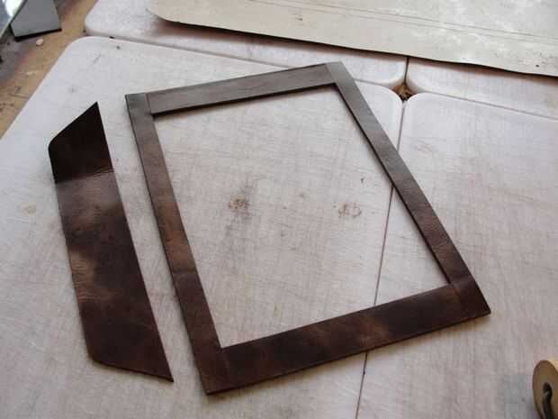 Corte las piezas para el frente de la pantalla. Juntos se hacen por dos piezas capas de cuero. Cada esquina se superpone para hacer un empalme fuerte. Use cemento de contacto para unir piezas.