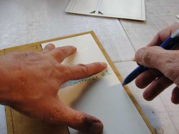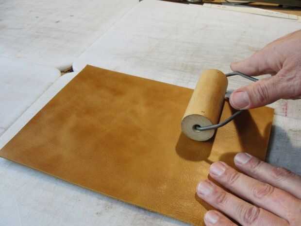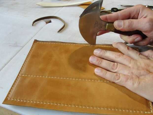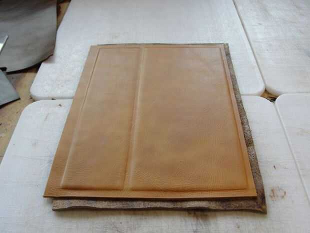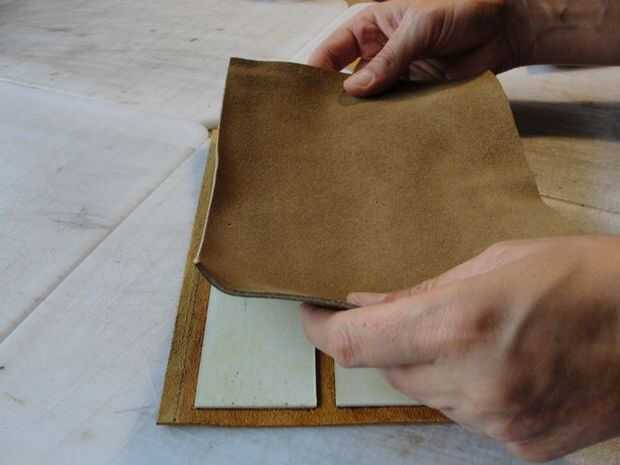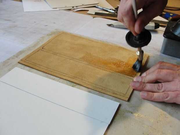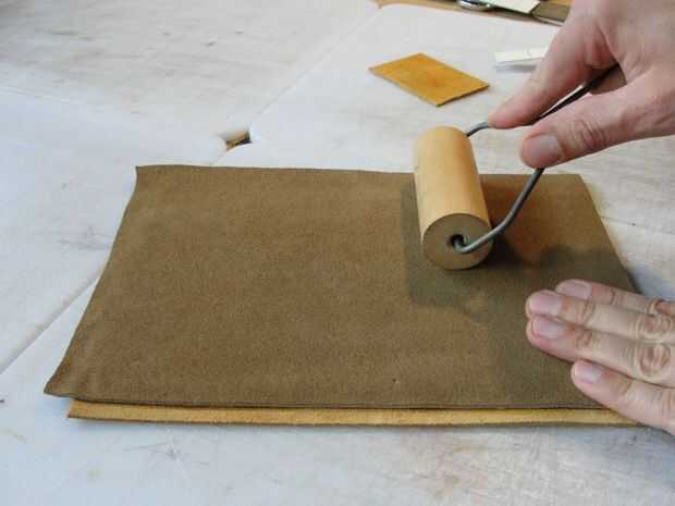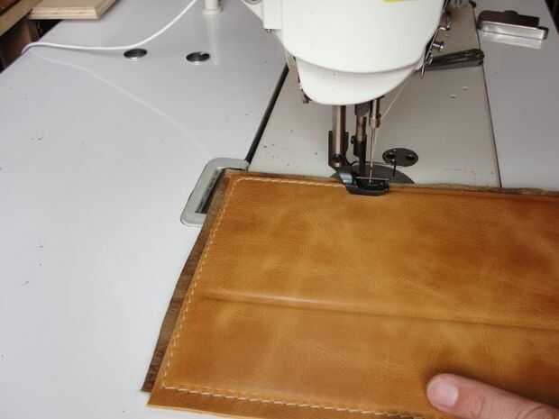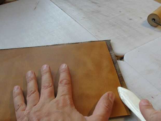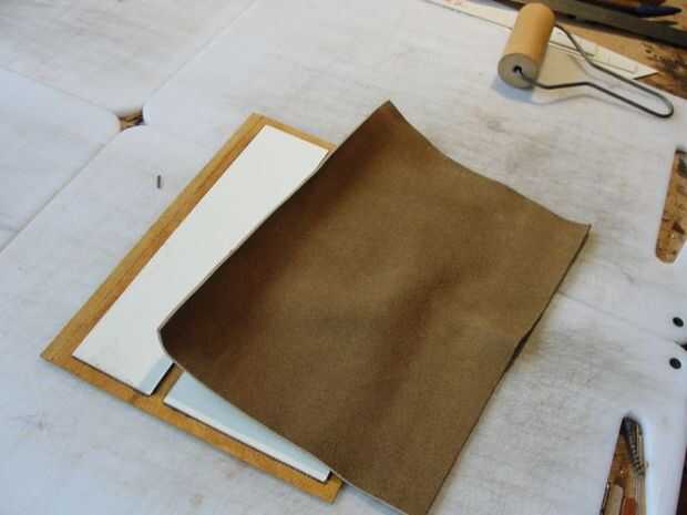 Cortar la pieza delantera y marcar en la parte trasera donde va el refuerzo. Use cemento de contacto para pegarlas. Cortar el interior de la tapa de gran tamaño sobre una 1/2" de suede. Pegamento para arriba. Utilice una carpeta de hueso o de la parte trasera de un rotulador para obtener el borde afilado alrededor de la pestaña. Coser alrededor de él y la línea de doblez. Corte el sobrante.