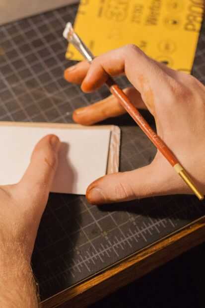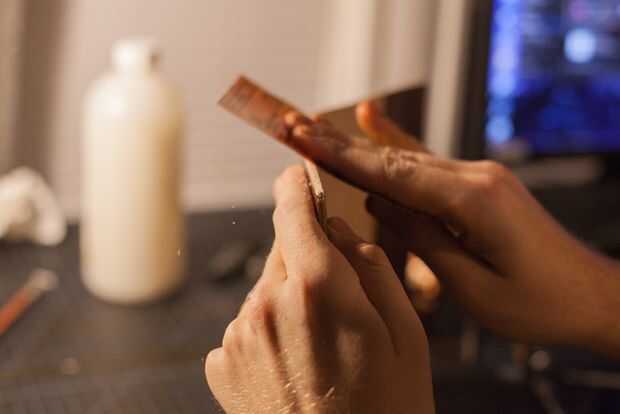 Ahora que la pieza se pega junto, compruebe los bordes. Si ellos no se alinean perfectamente, tómese el tiempo para cortar la parte sobrante con una cuchilla giratoria, x-acto o un cuchillo redondo. Si todos los cortes antes de esto fueron limpiamos, esto no será un problema, pero es fácil que esto suceda, así que no sudarlo si lo hizo. Si el exceso no es demasiado o no eso no sensible, lo corte. En su lugar, utilice papel de lija de grano 150 a nivel hacia fuera. De hecho, en este punto, debe golpear todos sus bordes con grano 150 para asegurarse de que están agradable y plana.