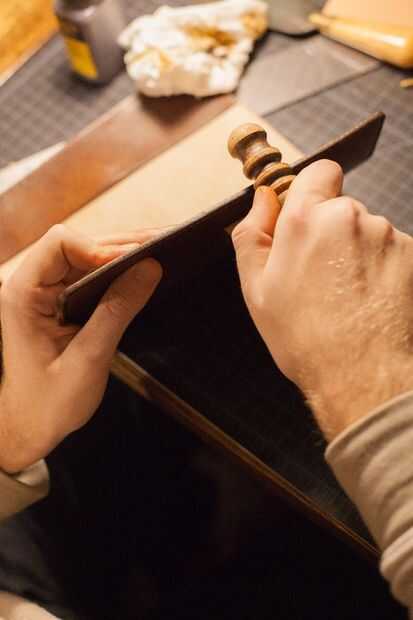 Algunos cueros tienden a enredar un poco cuando usted biselado. Si esto comienza a suceder, parar y mojar ligeramente los bordes con agua. Si esto continúa incluso después de mojar los bordes, reducir la presión que ejercen sobre el beveler y restablecer al beveler en el cuero cuando veas el principio de una pega.