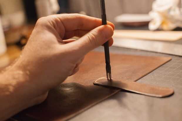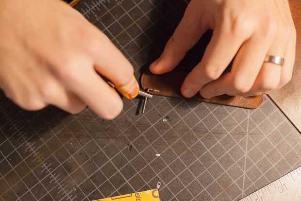 Mirar las líneas de costuras en la plantilla otra vez, alinear la costura Ranuradora a las líneas de costuras para que cuando ajuste la ranura en el borde, el agujero en el brazo pequeño se basa en la línea de puntos. Uso de la ranuradora para crear un canal de costura entre los dos agujeros que previamente realizado, arrastre la ranura alrededor de la curva, girando el cuero con la mano izquierda y asegúrese de tirar hacia abajo y hacia usted con el derecho. Esto creará un canal para la costura en y lento el desgaste de la rosca.