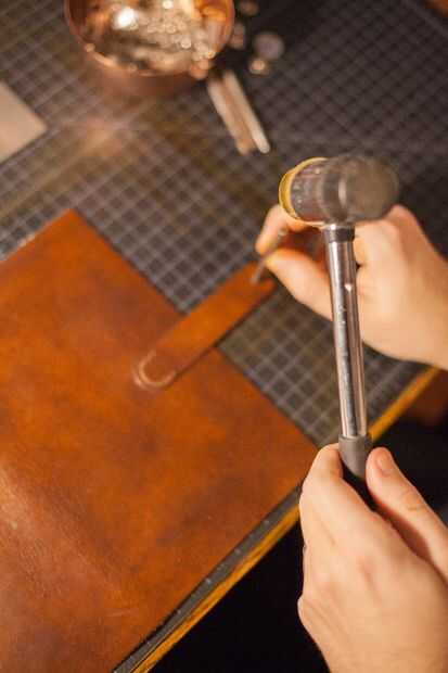 Ya que es una curva tan apretada, sugiero solamente usando un cincel dentado dos. Establece el primer diente en el agujero que hiciste antes, manteniendo el otro diente en la ranura de la costura. Ahora, usando un martillo de goma, golpear el cincel completamente por el cuero y la vuelva a tirar.