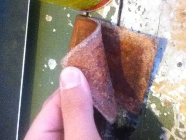él fue tan amable darme varios cueros exóticos para gratis, aquí tomé mi billetera de cuero regular (cuadro 1) corta el exterior (cuadro 2) se enfrentan y lo reemplazó con piel de tiburón (imagen 3) el resultado final es, obviamente, mi última foto.
