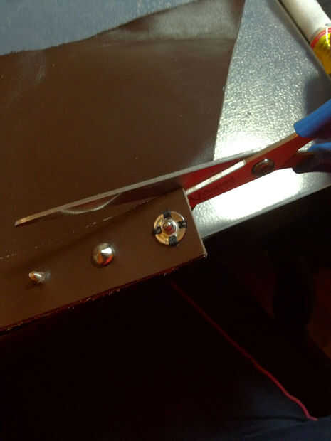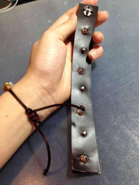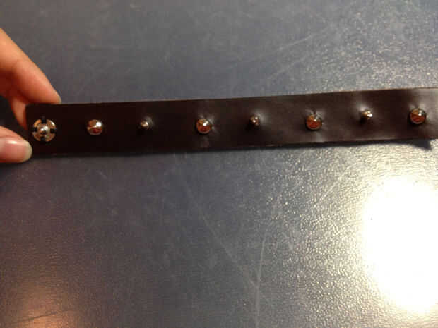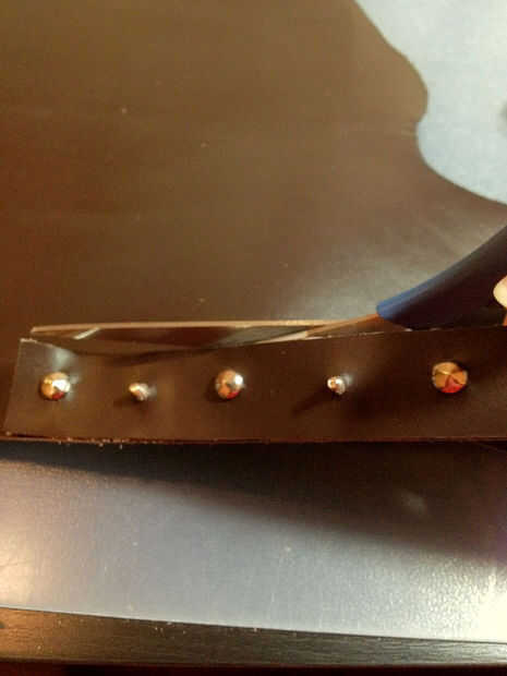 Ahora tienes una bonita tira doble capa de cuero, los tornillos y pernos conectados. Cuidadosamente recórtalo con las tijeras o una navaja afilada. Al igual que cuando estaban cortando el cuero antes, corta la piel en un ángulo de noventa grados para obtener bordes agradables para el pun ¢ o.