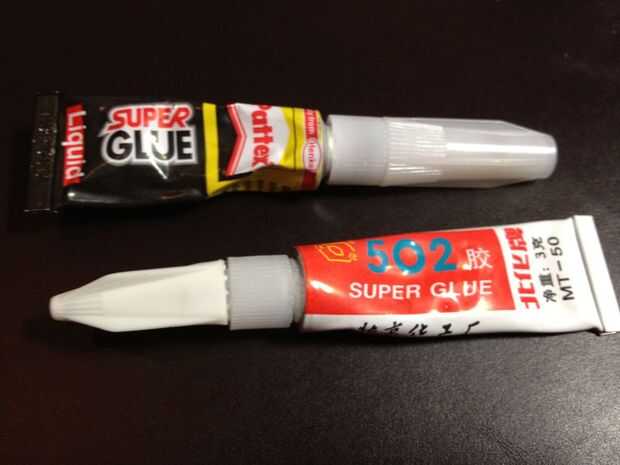 Una advertencia acerca de SUPERGLUE: Utilice una marca de buena calidad de superglue. En la imagen que os he adjunto son dos marcas de pegamento que probé usando. La marca barata de China estalló y se filtró en mis dedos cuando apreté cautelosamente hacia fuera en algunos restos de cuero y era absoluta diablos para bajar. Para los dedos, utilice una buena marca de pegamento. La piel de los dedos te lo agradecerán por esto. No es bueno para superglue en los dedos, y cuando se trata de que baje puede rasgar la piel en las manos en el proceso (créeme, lo sé...)