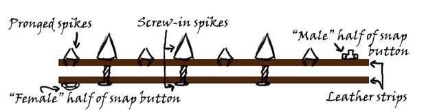Hay dos capas de este brazalete de spike, la capa superior, que se puede ver, y el inferior. Estas dos capas son superglued juntos para agregar resistencia y durabilidad a la banda. Se une por botones que se cosen encendido. Aspectos de los pernos prisioneros y mitad macho de botón a presión se unen a la capa superior y la mujer que la mitad del botón y el tornillo de los picos de pasan por la capa inferior.