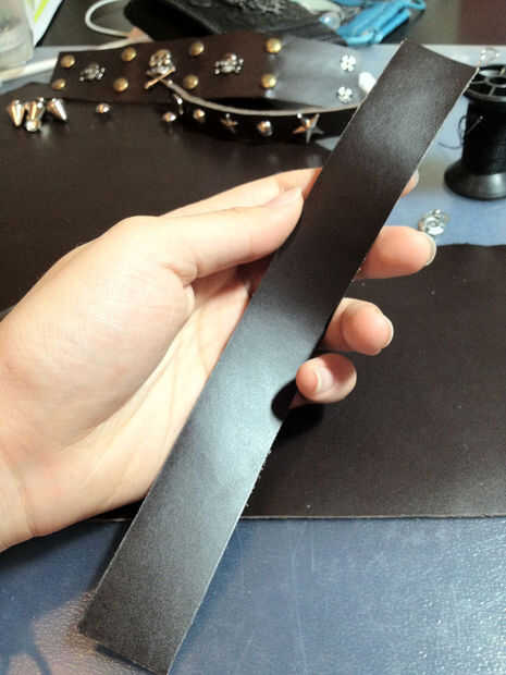 Coloque la regla en las líneas que trazaste y utilice su cuchillo de la maquinilla de afeitar o nave para anotar a lo largo de las líneas. Asegúrese de que la hoja esté perpendicular y cortando la piel en un ángulo de 90 grados. No quiere terminar con un brazalete con bordes inclinados, desaliñados.