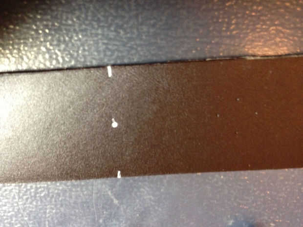 Marque la ubicación de sus montantes. Marqué la colocación de los montantes presionándolas ligeramente puntas hacia abajo en la piel, para que los dientes dejan una pequeña sangría. Luego usé mi pluma ir sobre ese guión como una guía para poder organizar más adelante.