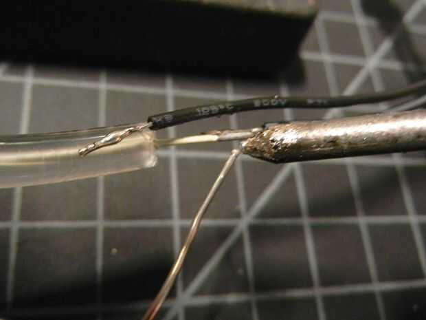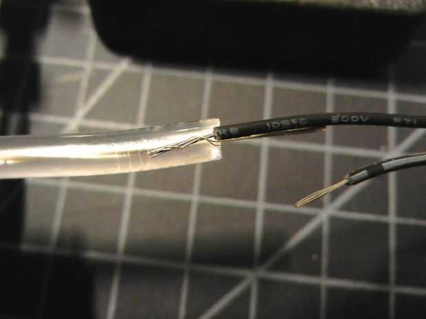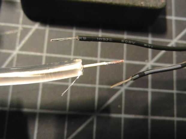 Cortar un trozo del cable negro a la longitud apropiada (para pelar los extremos de un conector del lado del alambre y soldadura el el alambre lo que 5mm rojo, sólo). Corte y pele los extremos de los cables de dos conductores para que alinee con el pelo cables y alambres de núcleo respectivamente. Envuelva cuidadosamente los hilos de cabello de el alambre en el extremo expuesto del cable.